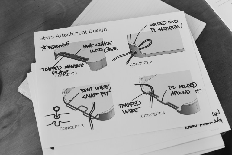 Learning that a strap attachment was indeed important, we went back to traditional cameras to understand how we could make our current experience better. Trying to balance thickness with durability we had several different concepts going. Through a cycle of design, prototype, and test, we began to narrow down the options. The biggest insight we found was that the angle of the “holes” in relation to the phone determined how hard or easy it was to attach a strap.